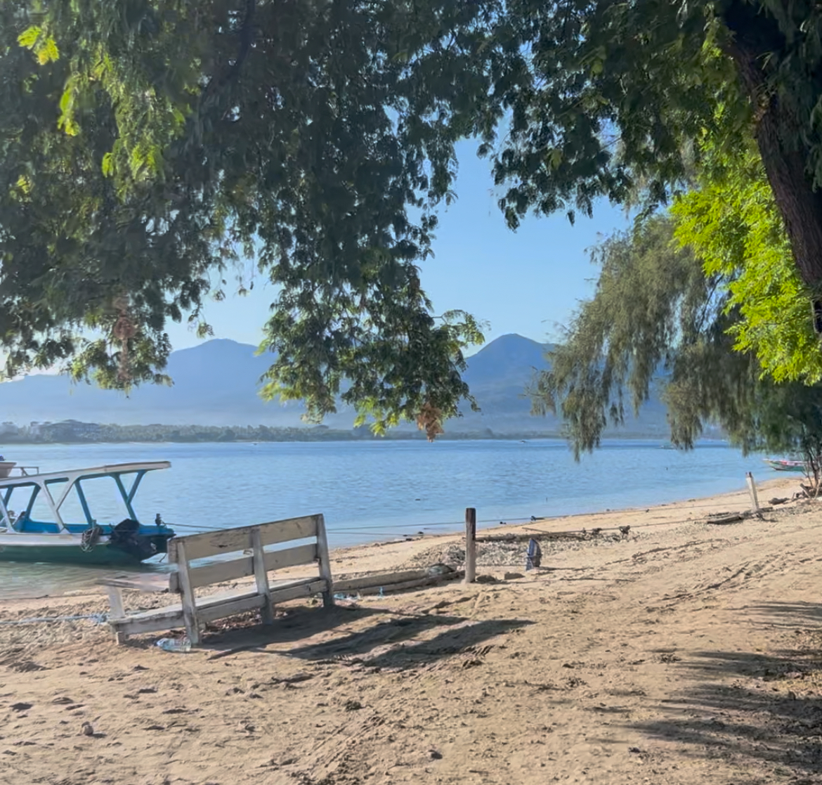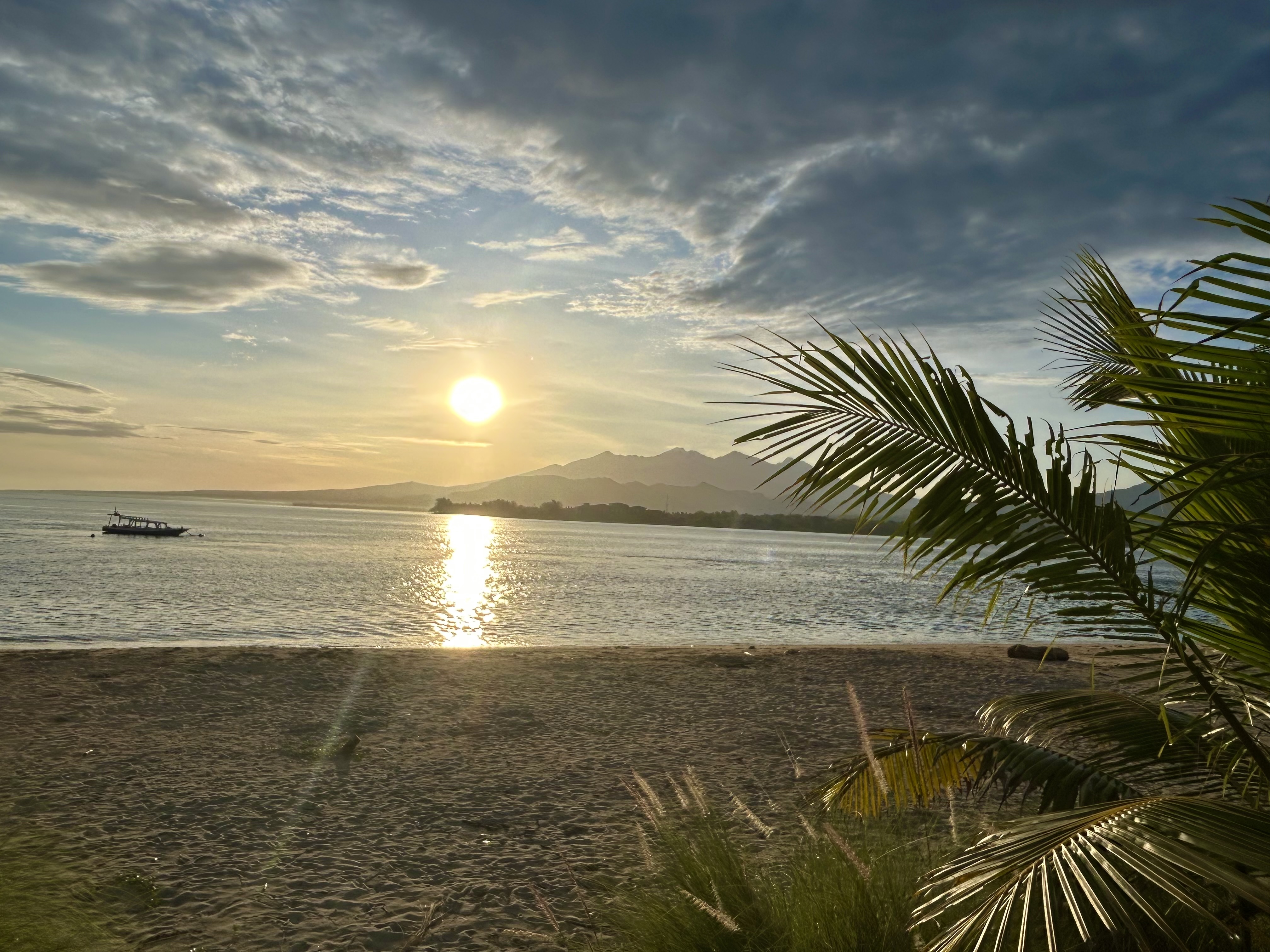 After landing, we were met by a lovely local driver (happy to share details) who took us to Bangsal Harbour, about a 1.5–2 hour drive. The journey is lovely — winding roads through low mountain forest, lots of monkeys on the roadside. That said, the weather for us was apocalyptic — huge thunderstorm, lightning, the works — and we honestly thought the boat ride was going to be terrifying. But in classic Southeast Asia fashion, the storm passed quickly and we arrived to sunshine and blue skies for our 15-minute private wooden speedboat to Gili Air.