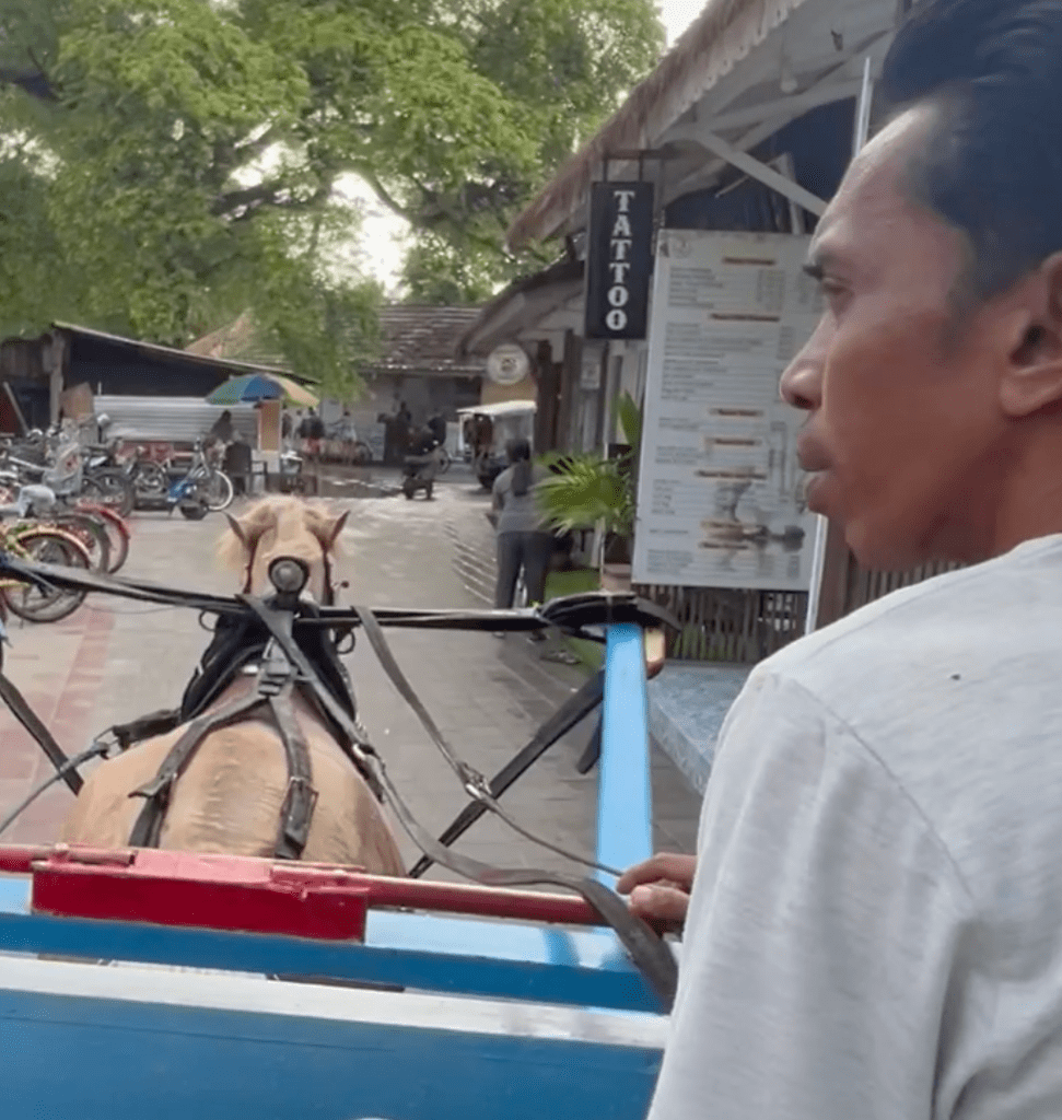 Gili Air is tiny — about 5km to loop the island. Our accommodation was around 2km from the harbour, and with bags (and slightly overexcited kids), we opted for the only transport option available: a horse and cart. Yes, it’s a bit touristy. Yes, they’ll try and overcharge you (don’t pay more than 150,000 IDR). But the horses looked well cared for, which made me feel better about it. And let’s be honest — for two tween boys, this was the ultimate arrival: