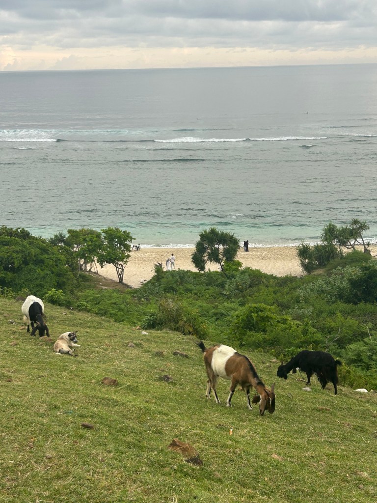 Going to Bukit Merese for sunset was our favourite pre dinner thing to do. Sitting just above Tanjung Aan Beach, it offers sweeping views in every direction. On one side, you’ll see the palm fringed stretches of Serenting and Seger Beach; on the other, the turquoise arc of the ever popular Tanjung Aan. My advice would be to not stop at the first viewpoint next to the car park which most people tend to do. Once you reach the top, turn left and keep walking. Follow the ridge along the headland, dipping into bays if you wish and climbing the next hill. The further you go, the quieter it gets and from every angle, you’ll catch a different jaw dropping view. It’s the kind of walk that turns into an adventure, and we loved doing it as a family, finding our own quiet spot to watch the sun go down. Even my boys, one of which doesn’t usually love a walk unless there’s food at the end, were totally into this one. We had an amazing time climbing, exploring, meeting friendly goats and scrambling over rocks and watching surfers from above.